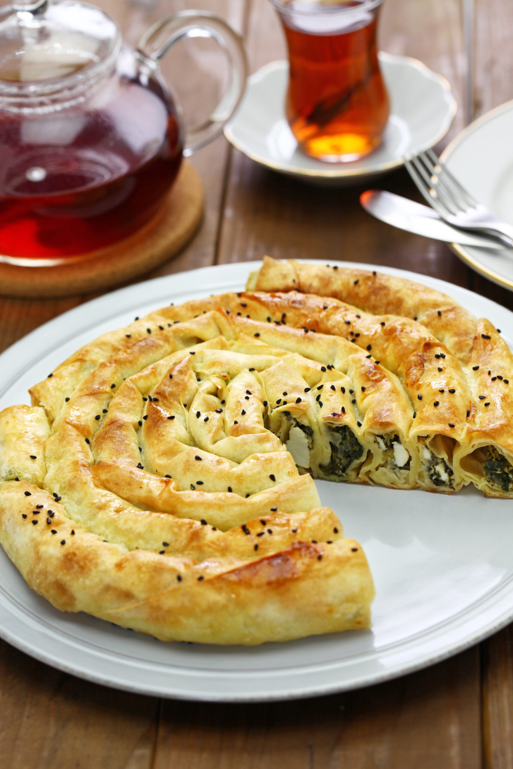 Préparé à base de pâte yufka ou de pâte filo, le börek est farci de fromage blanc salé (type beyaz peynir), d’épinards, de viande hachée ou de pommes de terre, selon les régions et les saisons. Il se présente sous différentes formes : roulé, en spirale, en couches ou en triangles, puis cuit au four ou parfois frit.