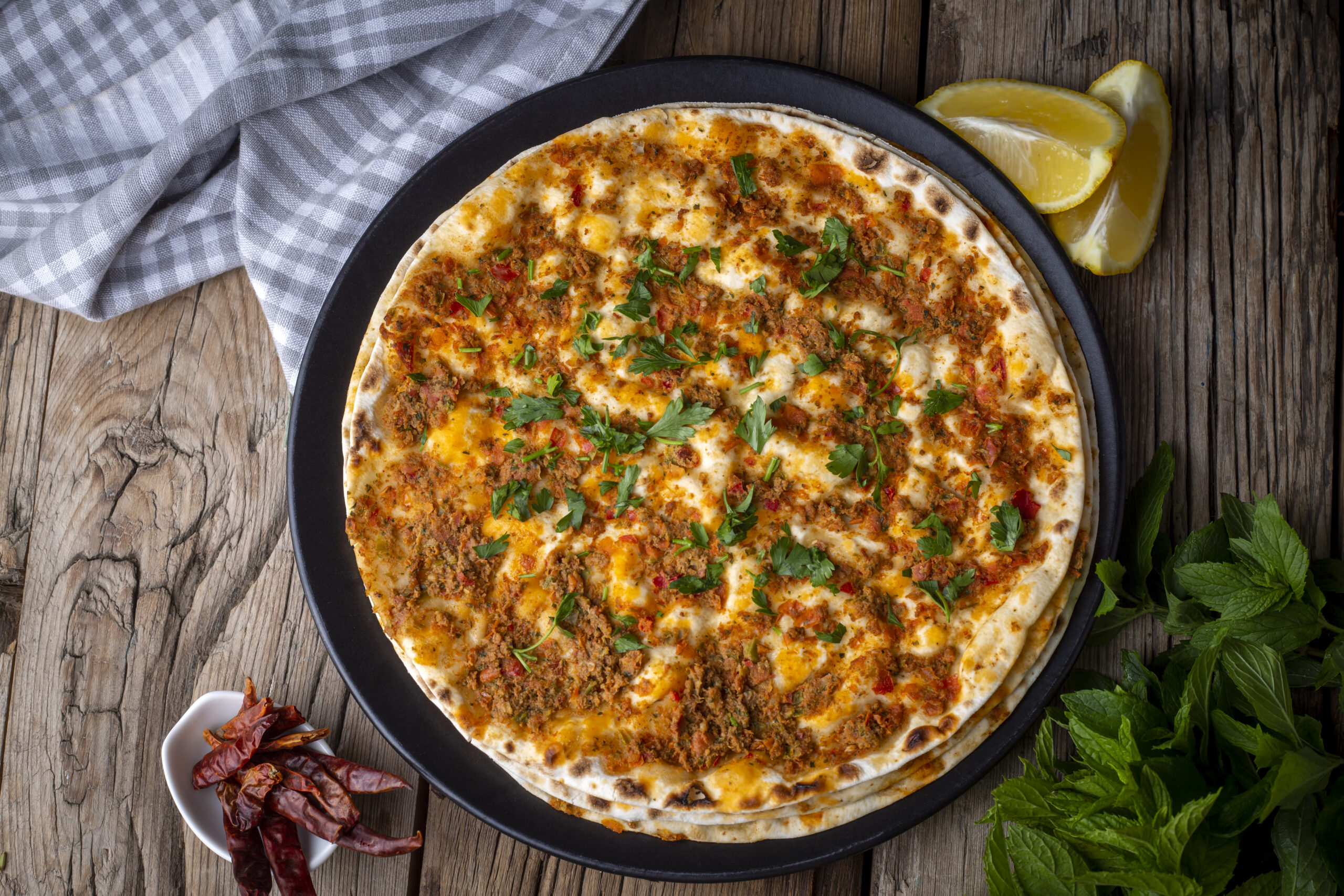 Souvent appelé à tort « pizza turque », le lahmacun est originaire du sud-est de la Turquie. Populaire dans la cuisine de rue, il est roulé avec des crudités et du citron pour un repas rapide et savoureux. Le lahmacun est une spécialité turque incontournable, souvent appelée « pizza turque ». Il se compose d’une fine pâte croustillante garnie de viande hachée (généralement de l’agneau ou du bœuf), mélangée à des tomates, oignons, ail, persil et épices orientales. Léger, savoureux et épicé, le lahmacun se déguste chaud, souvent roulé avec du citron, de la salade ou des herbes fraîches. Un plat rapide et typique, parfait pour une pause gourmande aux saveurs authentiques de la Turquie.